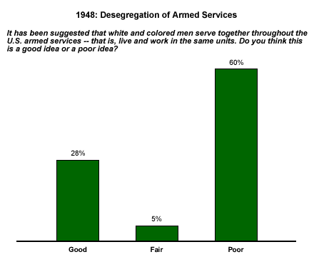 The counterpoint is that leaders sometimes move ahead of public comfort, especially when they can act through institutions insulated from immediate electoral backlash (executive orders, courts, military policy). Truman’s Executive Order 9981 (1948) desegregating the U.S. armed forces is a good example: morally right and supported by internal surveys, yet outside the political mainstream for the time.